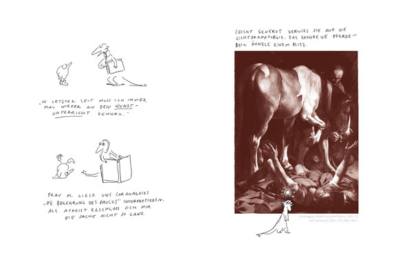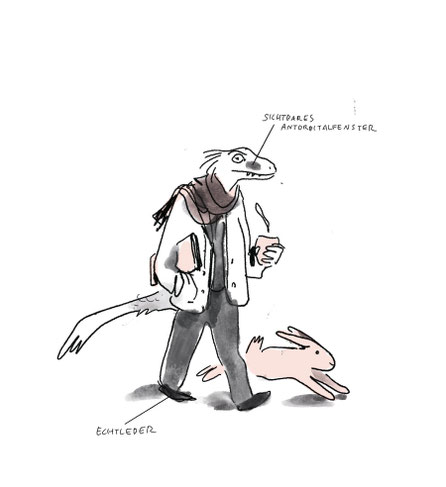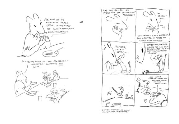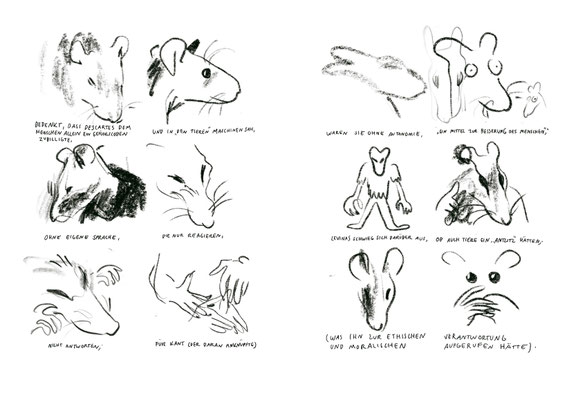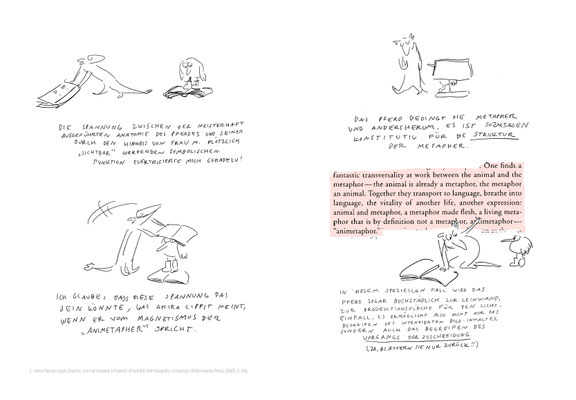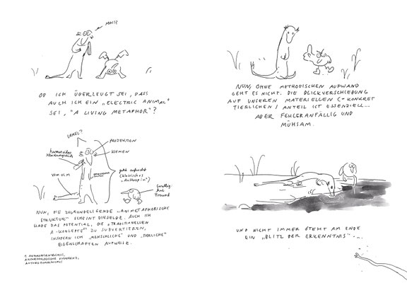 Dabei geht sie auf zwei Weisen vor: Einmal klassisch akademisch, einmal zeichnend und erzählend in der Form eines Comics. »Tiere richtig zeichnen« ist folgerichtig als Wendecover konzipiert, das so auch formal praktische und theoretische Erkenntniswege verzahnt.